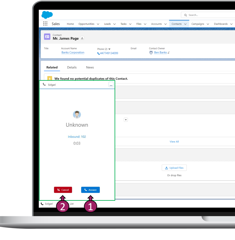 How to Answer A Call Andy Watson October 27, 2023 09:52 Updated Answer – When selected, the blue answer icon accepts the call. Cancel/Reject – The red cancel/reject icon can be selected to decline or cancel the call. How to answer a call Related to How To Solgari for Salesforce